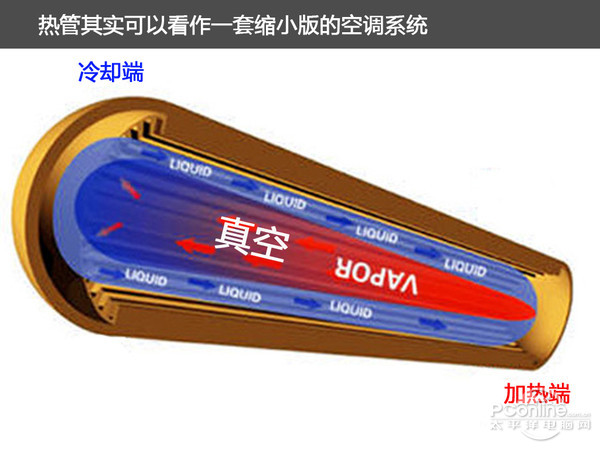 热管其实就是在一根封闭的铜管内壁上设置一层毛细多孔的吸液芯,同时热管内部还会抽空成低于大气压,最后充入沸点低易挥发的冷却液。当热管一端受热的时候,冷却液会挥发成气体并向热管的其他位置移动,当冷却到一定温度之后在管壁上凝结成液体,最终通过吸液芯的毛细作用重新流回受热部位。一根热管其实可以看作一个单独的散热系统,其工作方式与冰箱和空调使用的压缩机有一定的相似度,具有很高的传热效率,而且通常热管的粗细会与它的散热能力成正比。