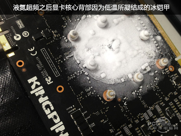作为极限超频中使用的散热方式,就不能再用这三个参数来衡量了,液氮在常温下直接汽化会吸收巨大的热能,从而将显卡制冷到零下200度左右的超低温,甚至会在显卡的表面形成一层冰铠甲。