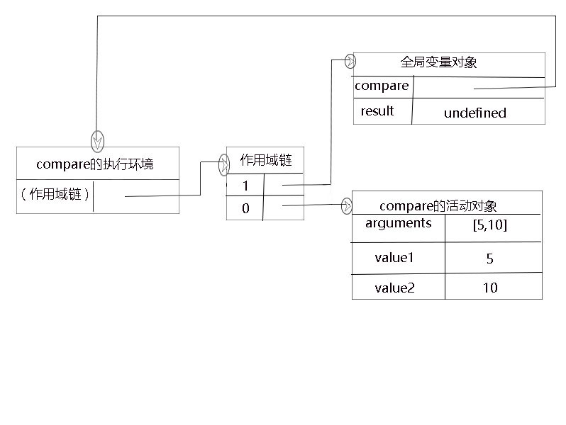 对于上述代码而言,全局执行环境的变量对象(再次声明:每一个执行环境都存在相应的变量对象)中包含result和compare,该变量对象在compare()执行环境的作用域链的第二位。