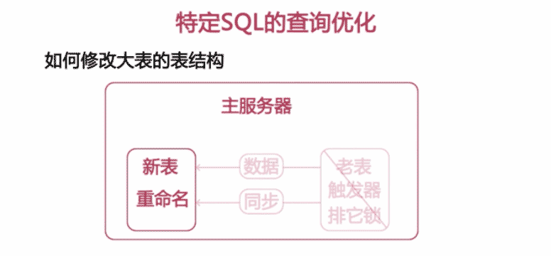 2、在主服务器上创建于一个新的表,表结构就是将要修改大表后表结构,再把老表的数据重新导入到新表中,并在老表中建立一系列的触发器,把老表的数据同步更新到新表中,当老表中的数据全部同步到新表以后,再对老表加排它锁,把新表改成老表的名称,删除重命名的老表,如下图所示