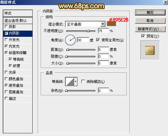 内阴影:颜色为:#895e2b,其它设置如下图。
