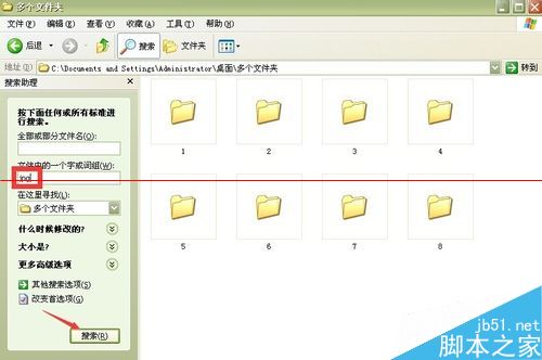 3、这时点击多个文件夹中的“搜索”功能,在出现的搜索框中输入:jpg。点击搜索。右侧窗口立即出现图片。