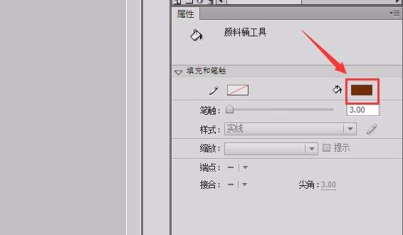 8、点击填充工具在右侧的属性里设置填充色为深棕色,如图所示: