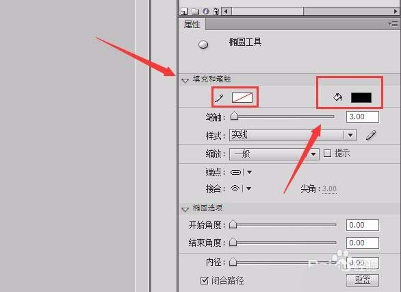 10、在工具箱内找到椭圆工具,并在属性里设置笔触颜色为无,填充色为黑色,如图所示: