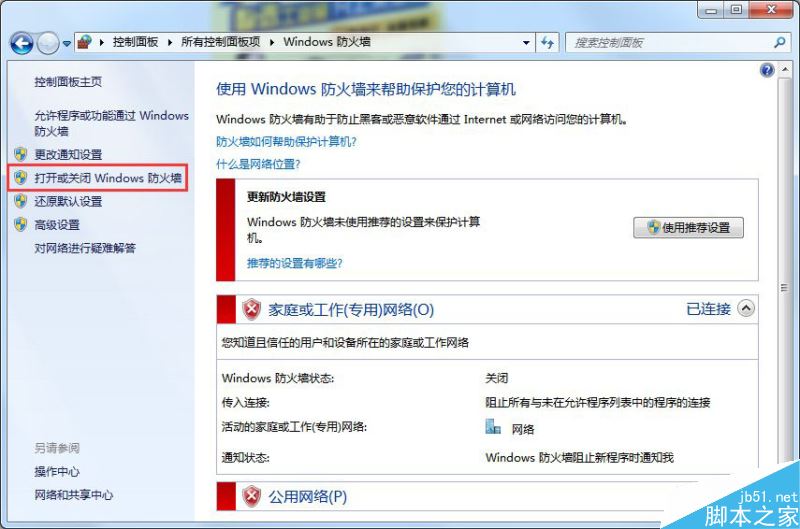 2、先点击“打开或关闭Windows防火墙”将Windows防火墙打开。