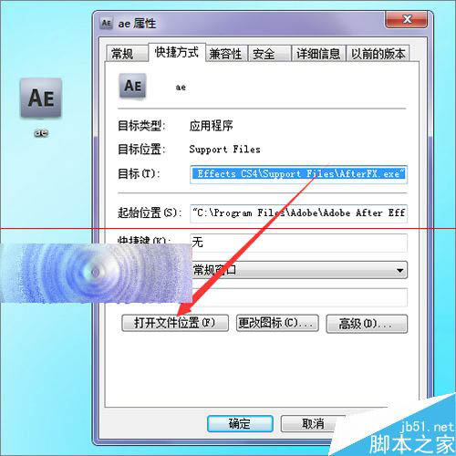 2、想要把多安装的插件进行移除,就需要找到安装插件的位置。这里就直接在桌面上ae的图标上面点击右键。然后在弹出的列表中选择打开它的属性。接着在它的属性界面中打开它的文件位置。