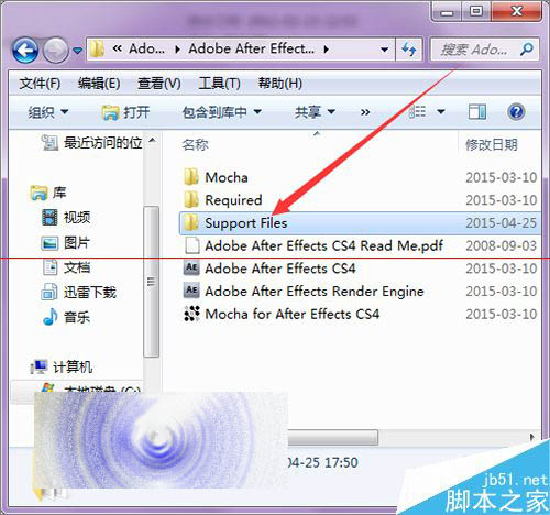 14、打开Adobe After Effects CS4的文件夹后,在它的列表中找到Support Files的文件夹并点击打开。接着在它的列表中点击打开Plug-ins的文件夹。
