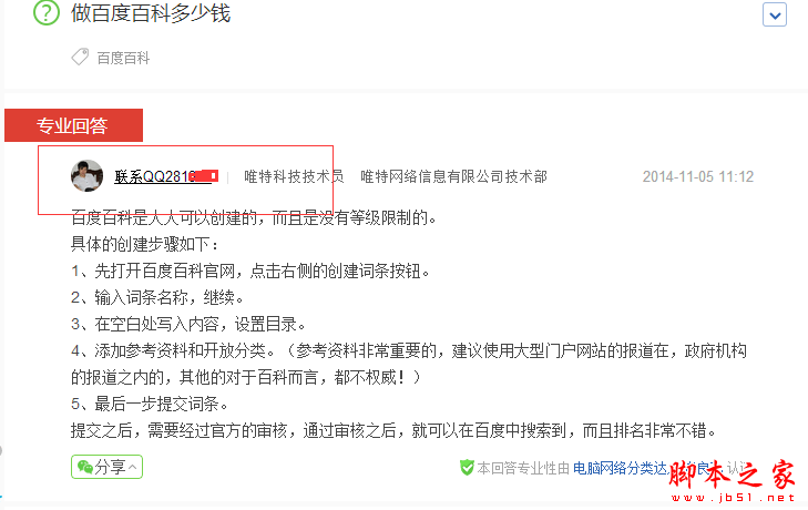 那么我相信一般人一眼就能看出来门道,但是有一点,这条答案的内容一定要对用户非常有帮助,并且内容排版非常清晰,最重要的内容不能有广告嫌疑,你软文写的在好,我相信能做百度的审核员,肯定是有点功底的,他们注重的是内容是不是真的有用!所以我们在操作中千万不要刷小聪明,自认为自己软文写的好,就去摆谱!这种方法在操作的时候要注意的是,最好是网上难找的业务,这样人家才会加你QQ才会联系你的,还有就是要显得你非常专业,这样效果是非常不错的哟!