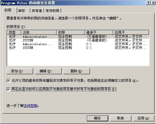 2.Program Files :右键文件夹->选择属性->选择“安全”选项卡->点击“高级”选项->选中“允许父项…”和“用在此显示…”->点击“复制”->点击确定,退出高级安全设置->把安全选项卡中除了administrators和system组之外的组或者用户删除
