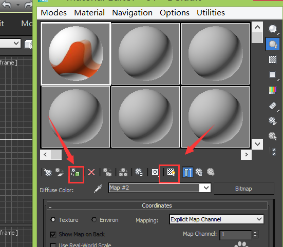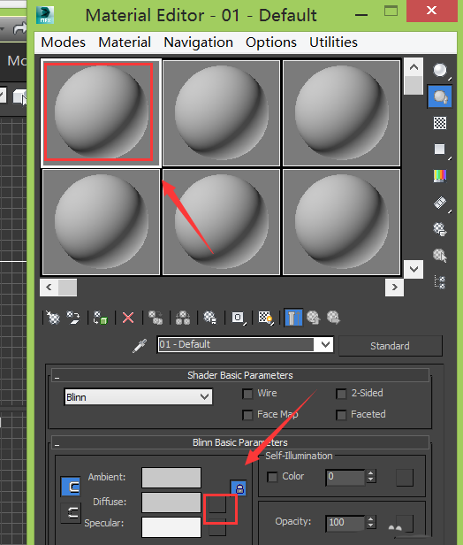 5、点击material editor选项,弹出material editor对话框,在该对话框内选择一个材质球并找到diffuse选项后的盒子,如图所示: