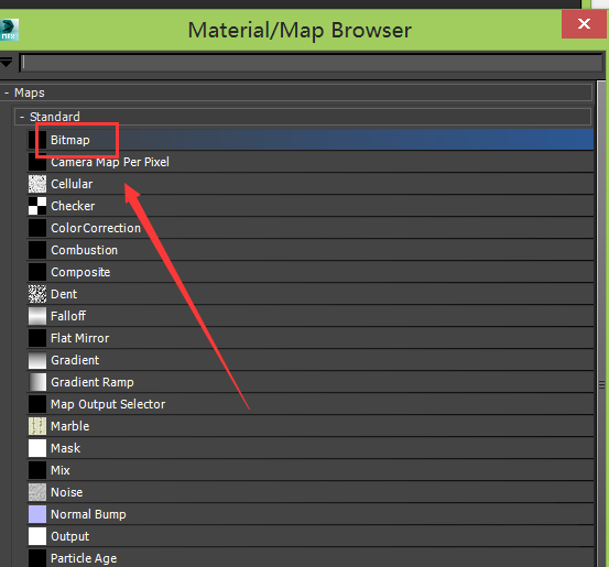 6、点击这个设置盒子,弹出material/map browser对话框,在该对话框内找到bitmap选项,如图所示: