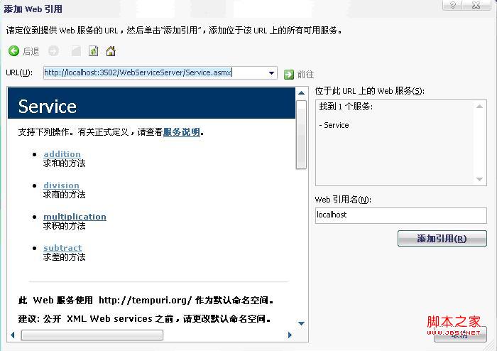 选好存储位置,语言后点击确定,进入默认页面。然后先添加Web引用,把WebService引到当前的工程里面。方法是:在资源管理器中点击右键,选择添加Web 引用,调出对话框: