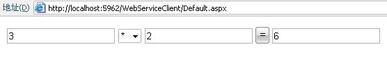 运行后可以看到效果,如下图所示,在前面两个Textbox里面输入两个操作数,在中间的下拉列表中选择操作符,然后点击"="号,将计算的结果输出到第三个Textbox里面。