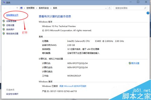 打开后出现系统版本与其他显示,找到左边框的选项,打开控制面板主页