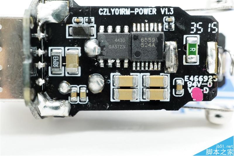 先来看下DC-DC同步整流部分的电路,PCB内部编号为CZLY01RM-POWER V1.3。规格中提到的支持12-24V输入,由图中编号为4430 GA5T2N、65595S4A两颗IC实现,其中左边的为MOS、右边的是来自AnaNaviTek的AN6559主控。两颗IC表面都做了磨砂处理,这样做可增大散热面积。图中左侧USB附近的R043精密电阻用于输出限流,起到保护做用;右侧丝印了R字符的绿色元器件为输入保险丝,也是保护用途。