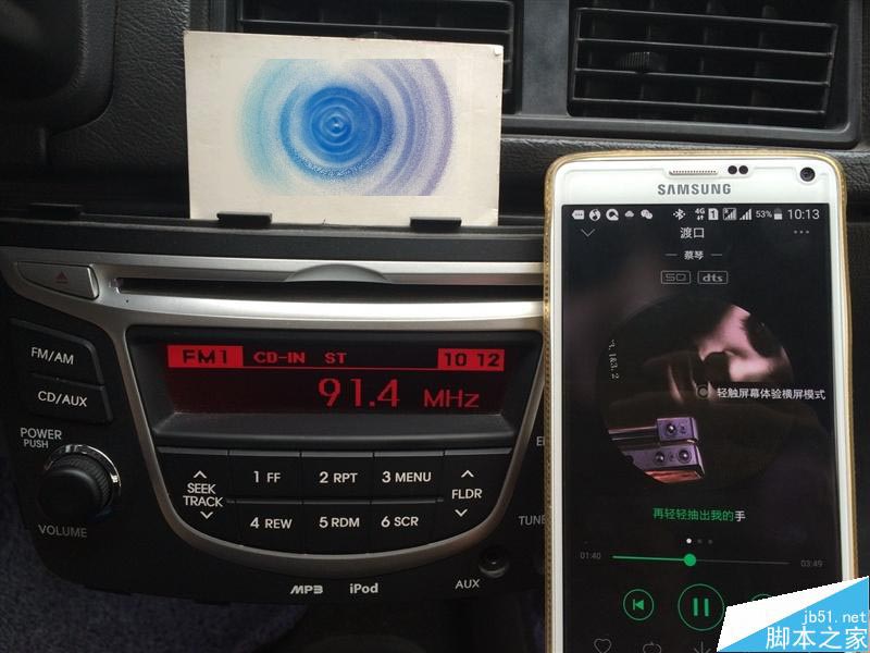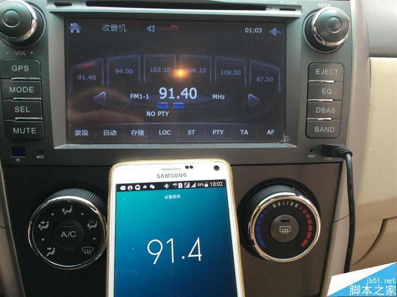 测试用的这台汽车没有蓝牙,但是FM收音机是必须有的。把汽车启动后,蓝牙连接手机,打开FM,将频段调至91.4MHz,配对成功。这里FM频段可在手机APP中任意调节。