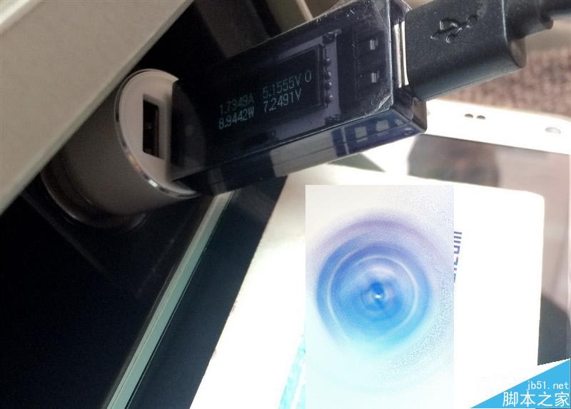车充的底部金属面为正极,采用了抛光处理,看起来像面小镜子。车充参数通过镭雕的方式排布在了圆圈四周。