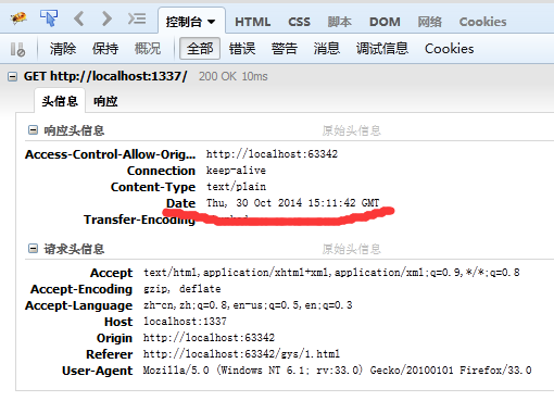 我们看一个HTML5页面中通过AJAX请求的方式获取HTTP服务器返回数据的代码示例.由于我们把服务器的端口指定为1337,并将从端口为80的网站中运行HTML5页面,因此这是一种跨域操作,需要在HTTP响应头部中添加Access_Control_Allow_Origin字段,并且将参数指定为允许向服务器请求数据额域名+端口号(省略端口号时允许该域名下的任何端口向服务器请求数据),