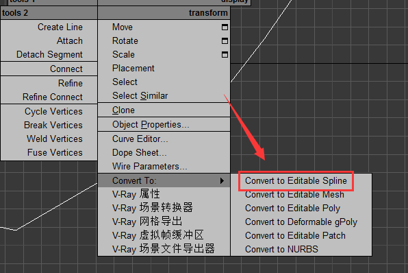 5、选择曲线单击鼠标右键找到convert to选项,点击该选项在其下拉菜单里找到convert to spline选项,如图所示: