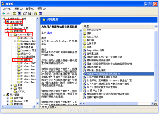 步骤二:用户配置---管理模块---Windows组件---终端服务,然后打开右侧窗格中的“允许用户使用终端服务远程连接”项;