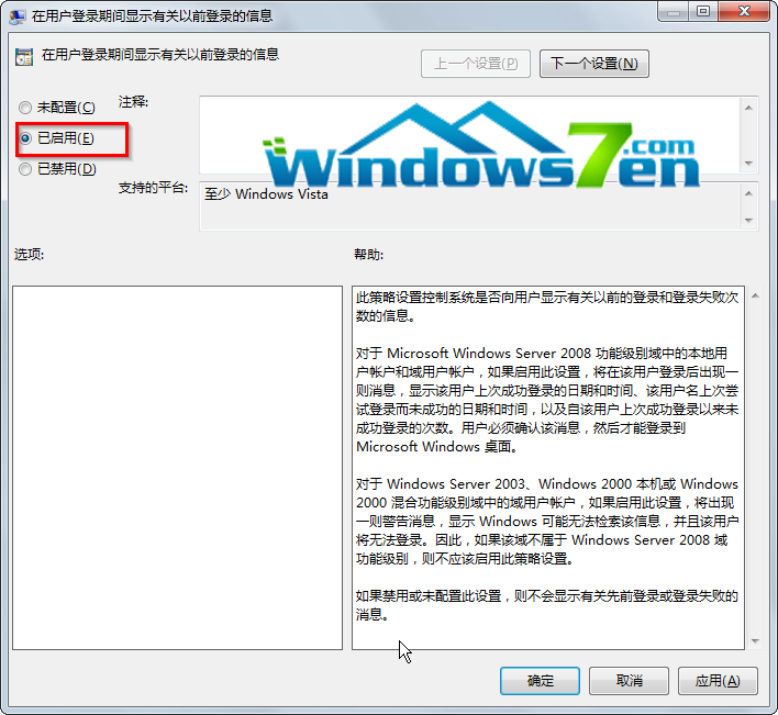 3、打开“在用户登录期间显示有关以前登录的信息项”,选择已启用单选项并应用。如图3所示