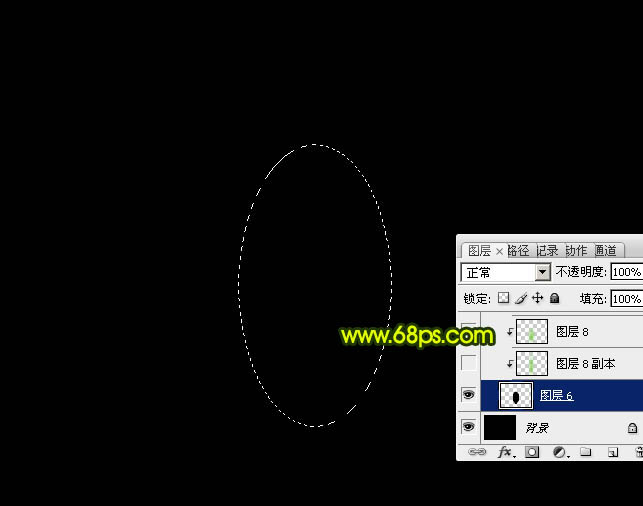 3、新建一个组,在组里新建一个图层,用椭圆选框工具拉出一个竖的椭圆选区,填充黑色,效果如下图。