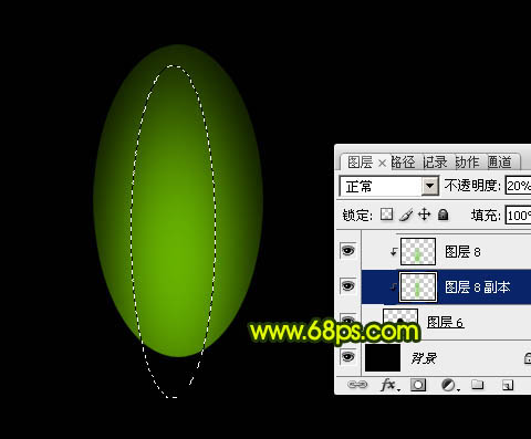 5、新建一个图层,用椭圆选框工具拉出下图所示的选区,羽化15个像素后填充同上的绿色,确定后把不透明度改为:20%,效果如下图。