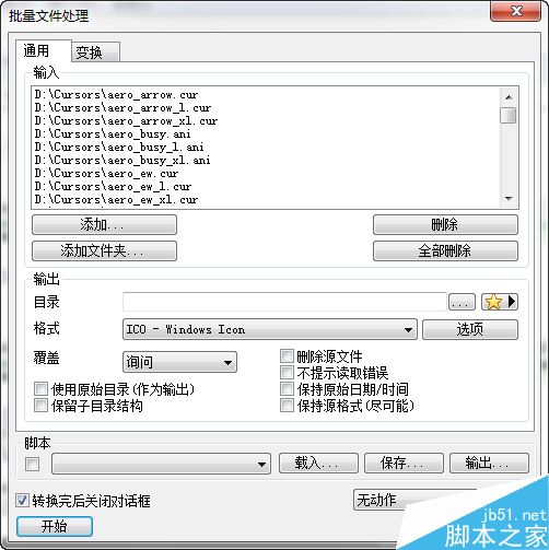接着通过XnView打开刚刚复制出来的文件夹,然后点击“编辑”菜单中的“选择全部”命令,将所有的鼠标指针文件都选择上。接下来点击“工具”菜单中的“批量转换”命令,在弹出的设置窗口中选择“格式”列表中的“ICO”。