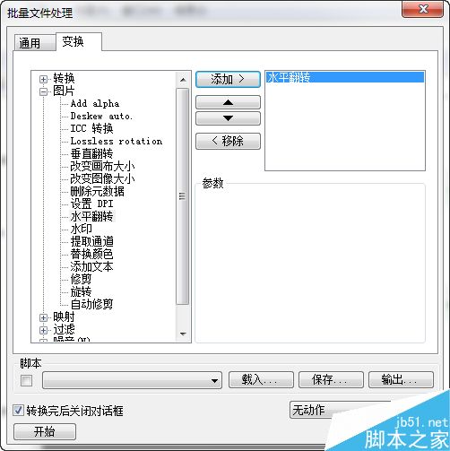 随后切换到窗口中的“变换”选项卡,选择“图片”中的“水平翻转”项,点击“添加”按钮添加到功能列表中。最后点击左下角的“开始”按钮,就可以一次性完成图片转换和图片翻转的操作了。