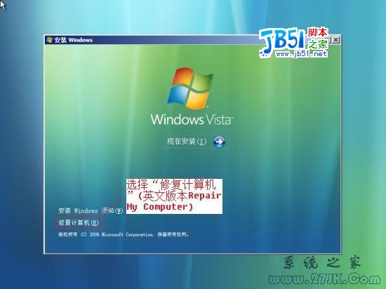 7、出现“开始安装界面”,(要注意了,不点击“现在安装”)点左下角“修复计算机”(repair my computer)。