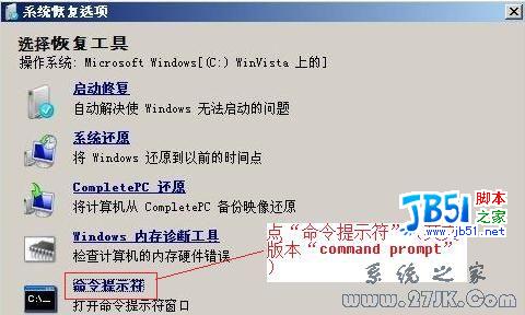 8、进入“系统恢复选项”,选择最后一项“命令提示符”(command prompt),进入DOS窗口。