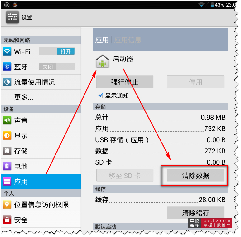 首先在【设置】里面选择【应用】,然后在全部应用里面找到【启动器】,然后在启动器里面选择【清除数据】,如下图: