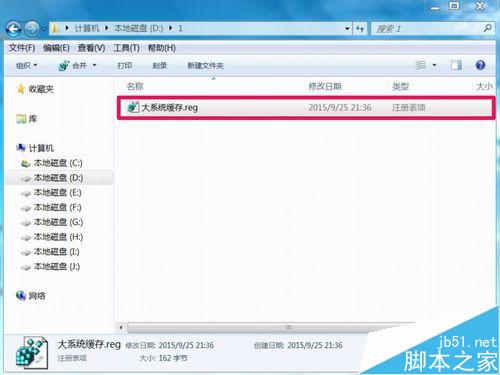 3、保存完成后,来到保存文件更大,找到并选择“大系统缓存.reg”文件,双击此文件。