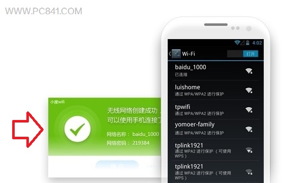 4、最后进入智能手机/平板电脑达到WAN无线网络,输入密码连接刚创建好的免费Wifi网络即可,如下图所示:
