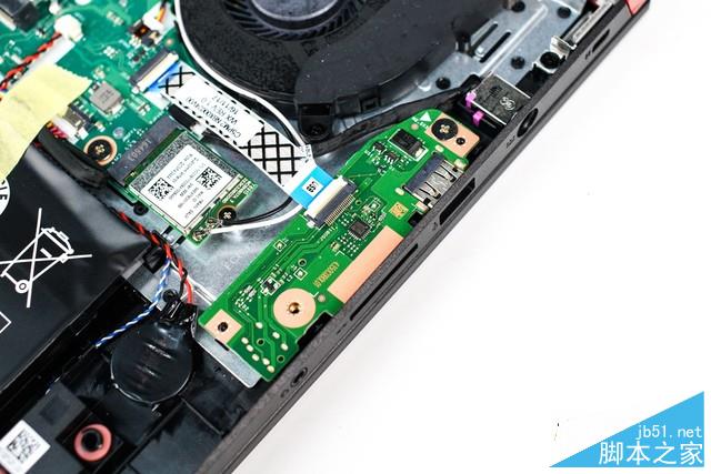 暗影骑士3的左侧接口(USB 2.0、读卡器、耳机麦克风接口),通过一根连接线与主板连接。而来自高通的无线网卡也设置在了这个连接线下方。另外值得注意的是,这个无线网卡的天线连接处并没有固定措施,这样就很有可能由于震动造成天线脱落。所以大家在使用的时候,如果出现WiFi信号突然变的十分差的情况,很有可能就是因为天线脱落造成的。