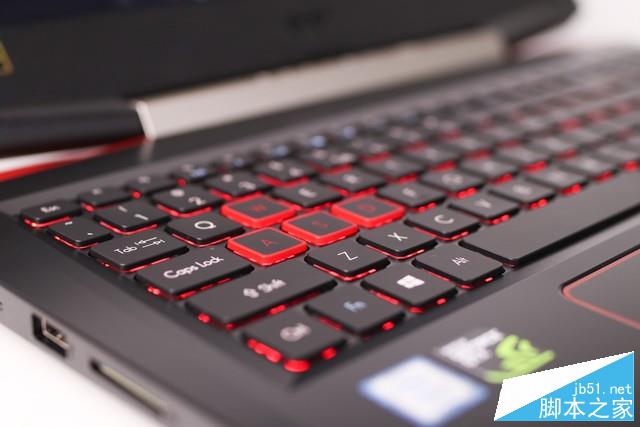 暗影骑士3尾部的设计是笔者觉得最好看的地方,两个出风口的设计造型应该是借鉴了兰博基尼的跑车尾部元素,显的动感十足。整机采用游戏本常用的红黑配色,玩家常用的WASD四个键帽做了特殊的红色半透明包边处理,能够在键盘背光开启之后,强化红色背光的呈现。