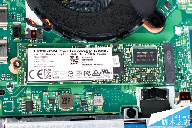 打开后可以看到整个的内部布局还是比较常规的,双铜管双风扇散热设计、M.2接口的SSD,双内存插槽、内置电池、机械硬盘被放置在了右侧掌托的下方。用户可以非常方便的更换SSD、机械硬盘以及内存条。