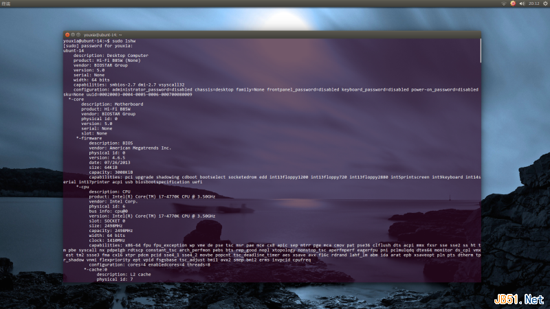 而且从上图中可以看到,虚拟机中的CPU虽然显示为3.5GHz,但是很显然是QEMU模拟出来的,和物理CPU有显著差别。事实上我的电脑配置相当强悍,Core i7-4770K的四核八线程CPU,请看lshw的输出结果: