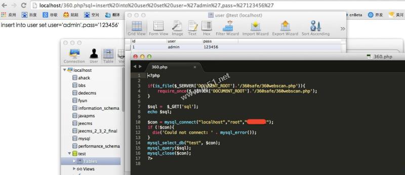 http://localhost/360.php?sql=insert into user (user,pass) values ('admin','123456')