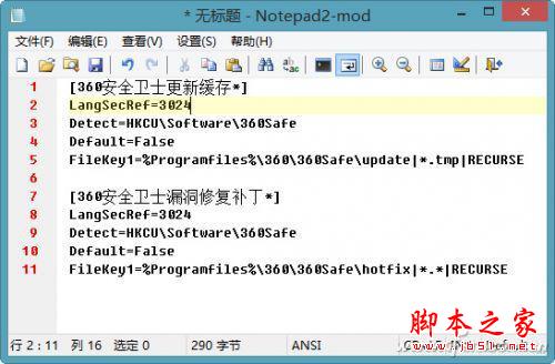 图中[Name*]参数代表清理规则的名称,这里设置的是“[360安全卫士更新缓存*]”。“LangSecRef=”代表程序类别,比如3024就代表实用程序。“Detect/DetectFile/SpecialDetect=”代表检测的软件文件,或者注册表项目是否存在,这里检测360安全卫士的注册表项目,以判断系统中是否安装了它。只有在设定的信息检测存在时,才会进行相应的垃圾清理操作。“Default”参数默认为 False,表示自定义的清理规则软件默认并不选中。最后的“FileKeyX/RegKeyX=”参数,代表清理文件的目录或者注册表项目。