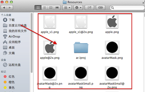 第二步:将得到的两张图片分别复制一份,得到4张图片。将两张小分辨率图片分别命名为 apple.png 和 apple_s1.png,将两张大分辨率图片分别命名为 apple@2x.png 和 apple_s1@2x.png。