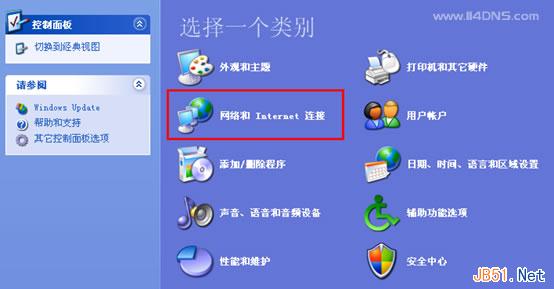 如桌面没有"网上邻居"图标,您可以打开系统"控制面板",选择"网络和 Internet 连接",如下图: