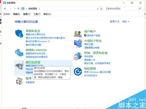 2、打开控制面板,点击”硬件和声音“。