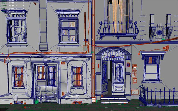 我必须说纹理制作是我在整个项目制作中最喜欢的部分!UV贴图是用平面贴图完成的,展开之后调节重叠的边缘。大部分的物体我都是用的标准玛雅描影器和法线贴图、漫反射贴图、反射贴图和特殊贴图,还有一些MR材质做更小的元素。我在每一个物体的上面都覆盖了大量的纹理以得到最终的效果。我真的很喜欢制作大的纹理,在这个项目中主要建筑的分辨率大约是每个纹理2k。