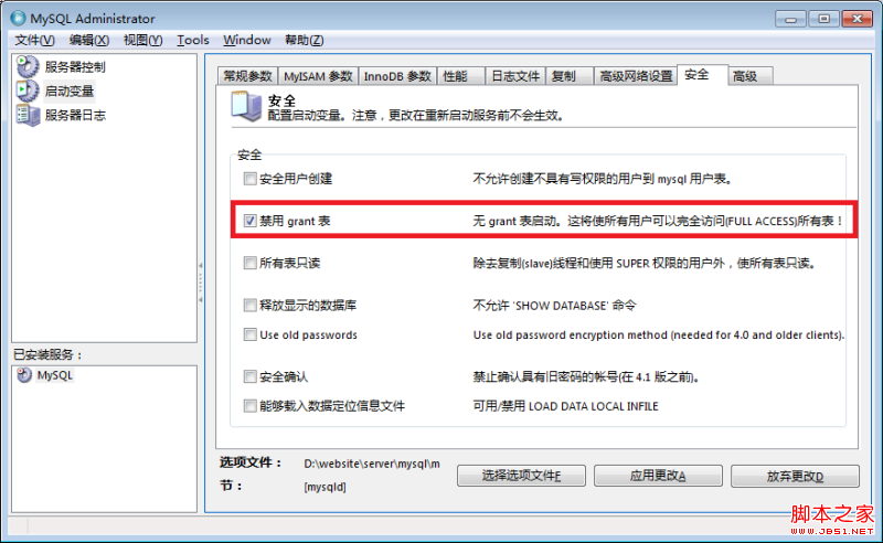并回到左侧的“服务器控制”,和右侧相应的“开始/停止服务”标 签,点击启动服务。此时,连接mysql已经不需要用户名和密码了,你可以修改root密码。
