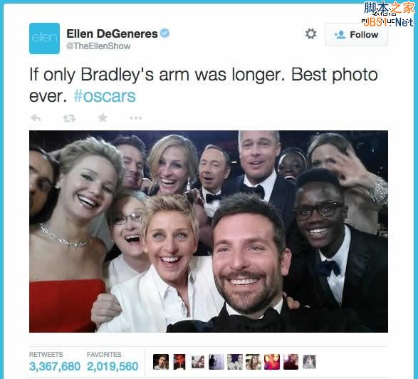 这或许是社交网络上传播最广,关注度最高的一张自拍照。在本届奥斯卡奖颁奖典礼上,主持人艾伦-德詹尼丝(Ellen DeGeneres)与詹妮弗-劳伦斯(Jennifer Lawrence)、布莱德利-库珀(Bradley Cooper)等大牌影星完成了这张史无前例的自拍照。这张自拍照上传到Twitter之后转发量立马超过了百万次,之后《华尔街日报》确认这是一次事先策划好的营销活动。三星与奥斯卡组委会达成了植入广告协议,尽管这张自拍照没有提到三星这个品牌,但却起到了无与伦比的广告效应。