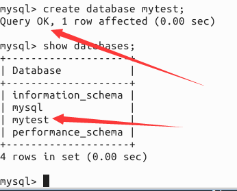 2.3 创建数据库:create database mytest;这样就创建了一个数据库B,库名叫mytest.