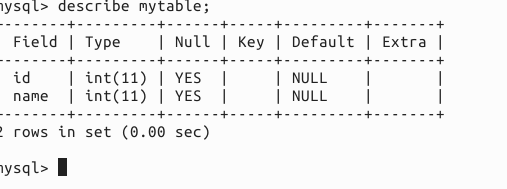 createtablemytable(idint,nameint);