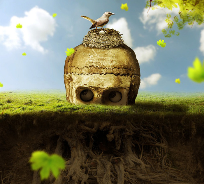效果图看上去非常抽象,合成难度并不大。过程:先把土壤、地面、天空等融合好;然后加入树根、骷髅、鸟巢等作出大致主题;后期增加树叶等装饰即可。
