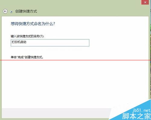 2、快捷方式的名称栏,建议输入“打印机启动”等方便自己识别记忆的名称。然后,单击“完成”